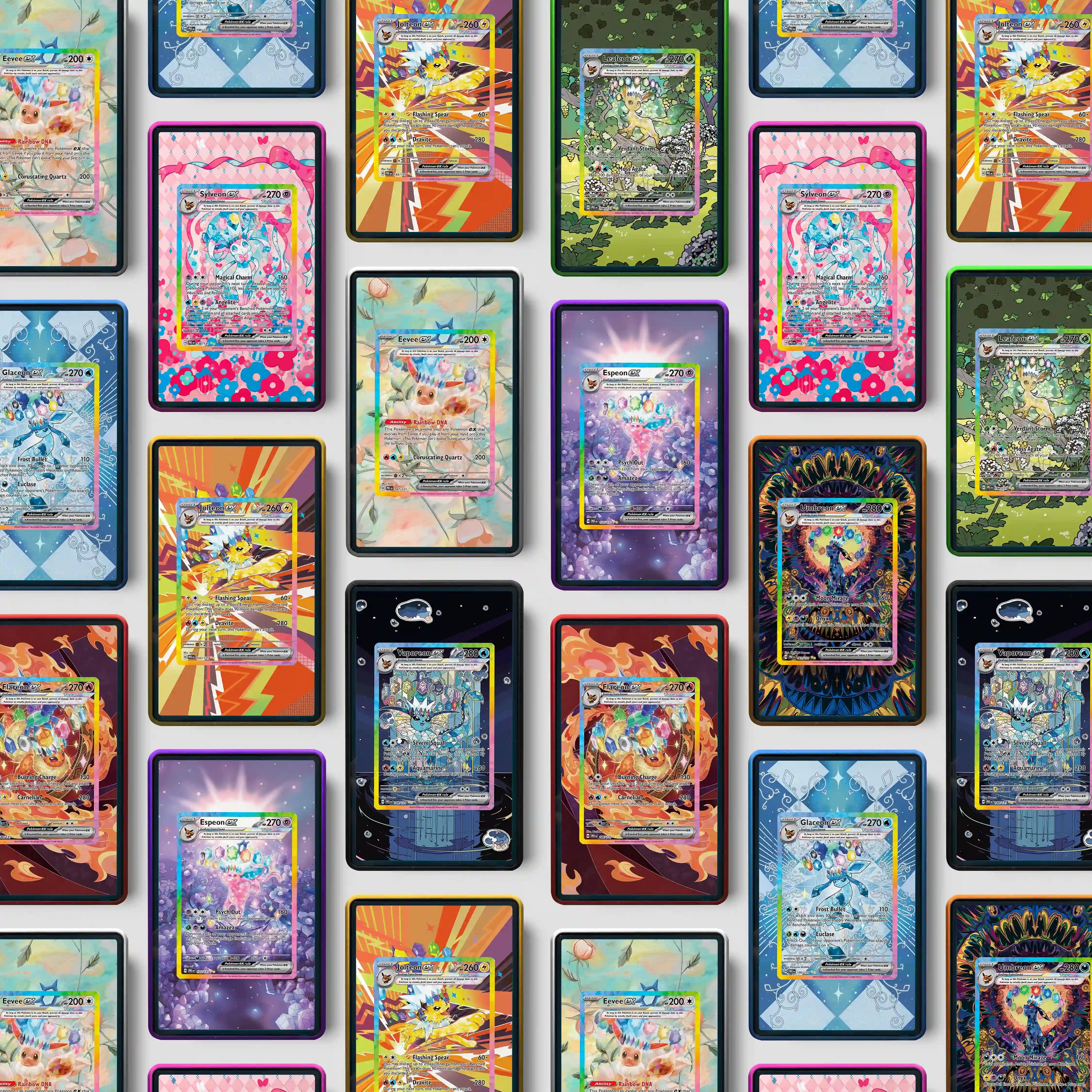 Celebrate your favourite evolutions with premium extended-art prints designed to go beyond the border. Each Eeveelutions bundle includes exclusive artwork, Colour matched protective display cases, and stand for true fans.